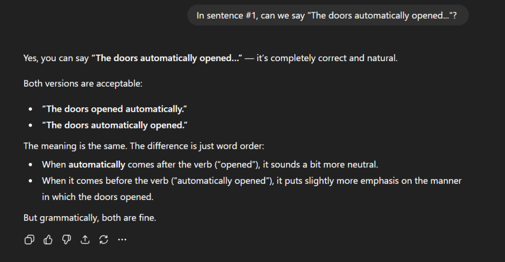 What’s important is that you can then ask follow-up questions. You can ask what exactly one sentence meant or whether a word could be used in a different part of a sentence. You might see another word used and ask for a simple explanation of its meaning. It’s a great idea to ask questions like, “Why did you say ____?” or “Can we change sentence #2 to use this word?” You could ask why “automatically” appears before a verb and whether it’s possible to move it elsewhere in a sentence.