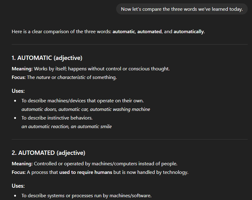 You can also ask it to give you synonyms, which are similar words, or to give you related words, such as “automatic” and “automated,” then you can learn sentences in which these can be used.